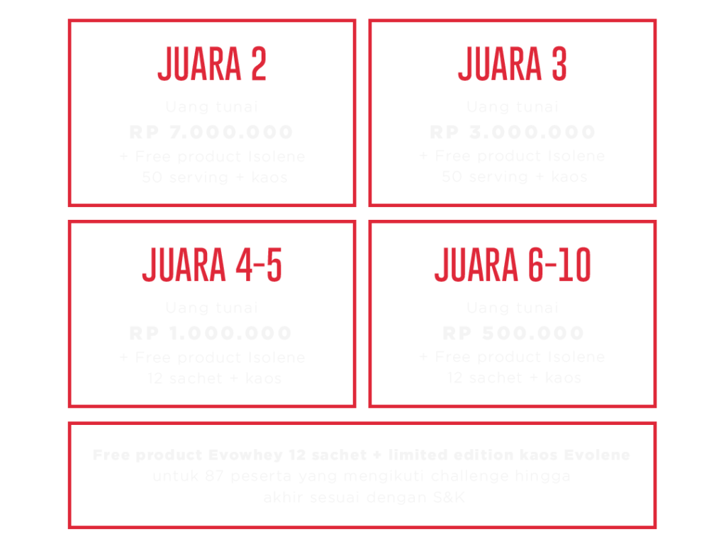 - Juara 6-10: Uang tunai 500ribu + Kaos Evolene + Free produk Evolene + Latihan Bareng Chrisna