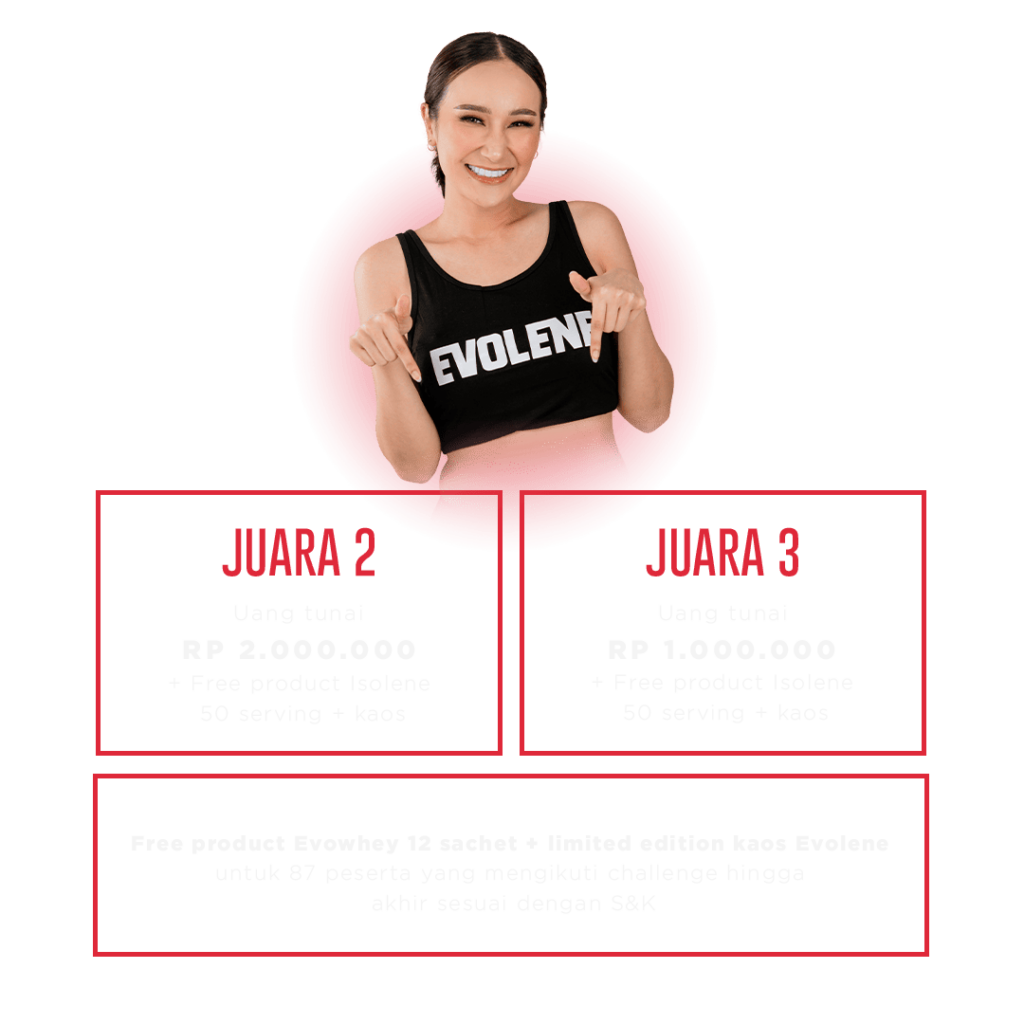 - Juara 2: Uang tunai 7juta + Kaos Evolene + Free produk Evolene + Latihan Bareng Chrisna
